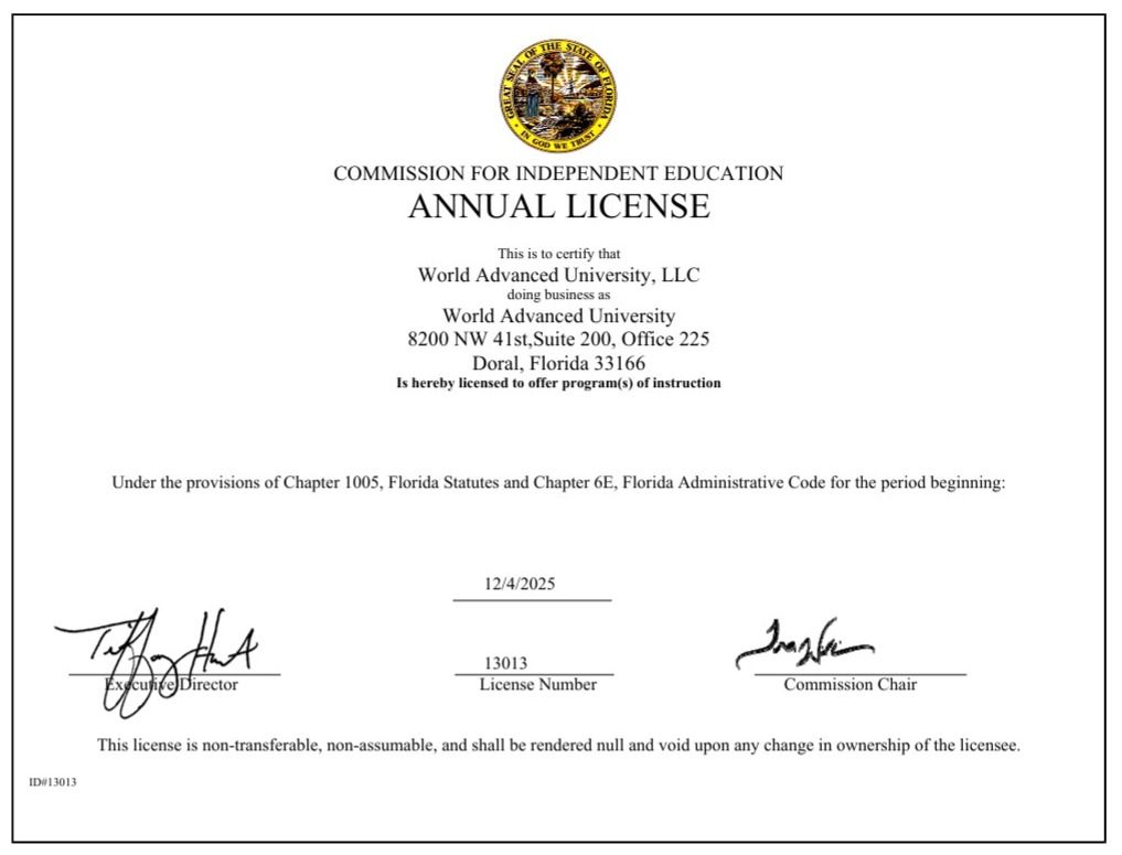 La Universidad Avanzada Mundial está licenciada por la Comisión de Educación Independiente de Florida, Departamento de Educación de Florida, Licencia #13013. Puede obtener información adicional sobre esta institución contactando a la Comisión en: 325 West Gaines St., Suite 1414, Tallahassee, FL, 32399-0400; Número de teléfono gratuito (888) 224-6684 (www.fldoe.org/cie).
